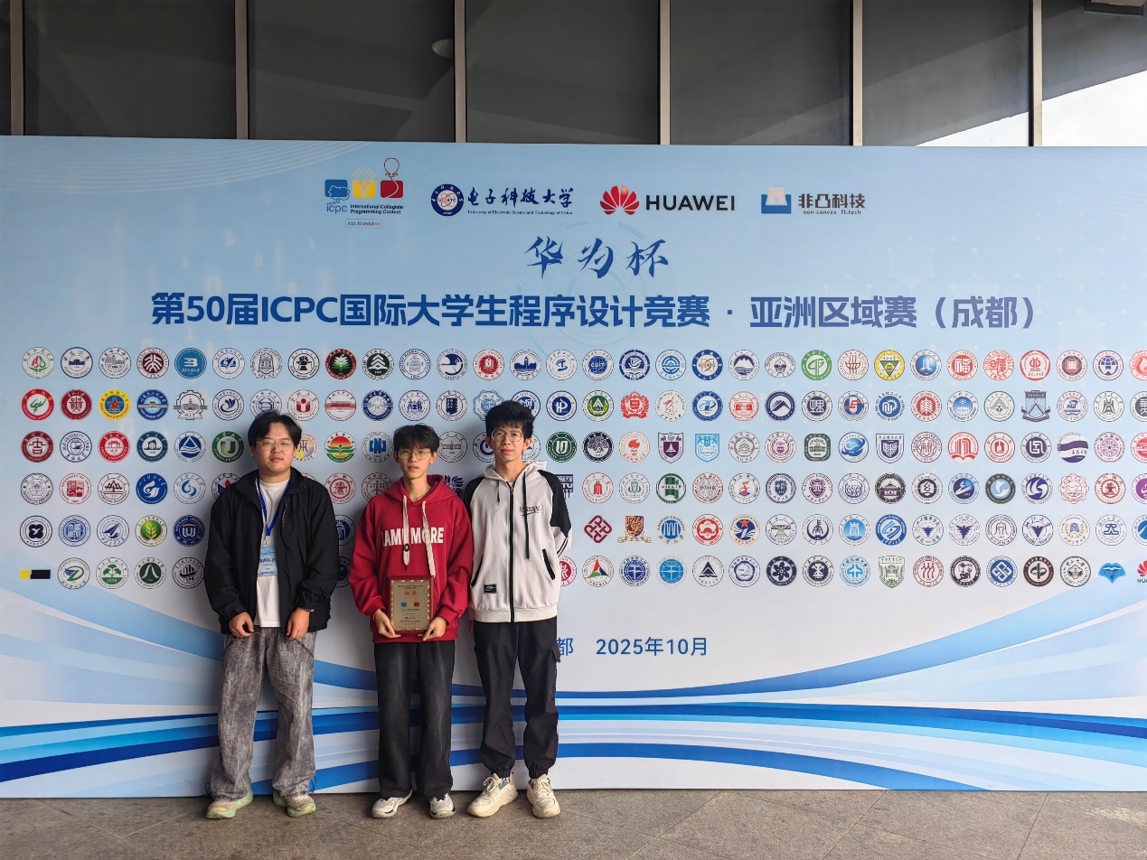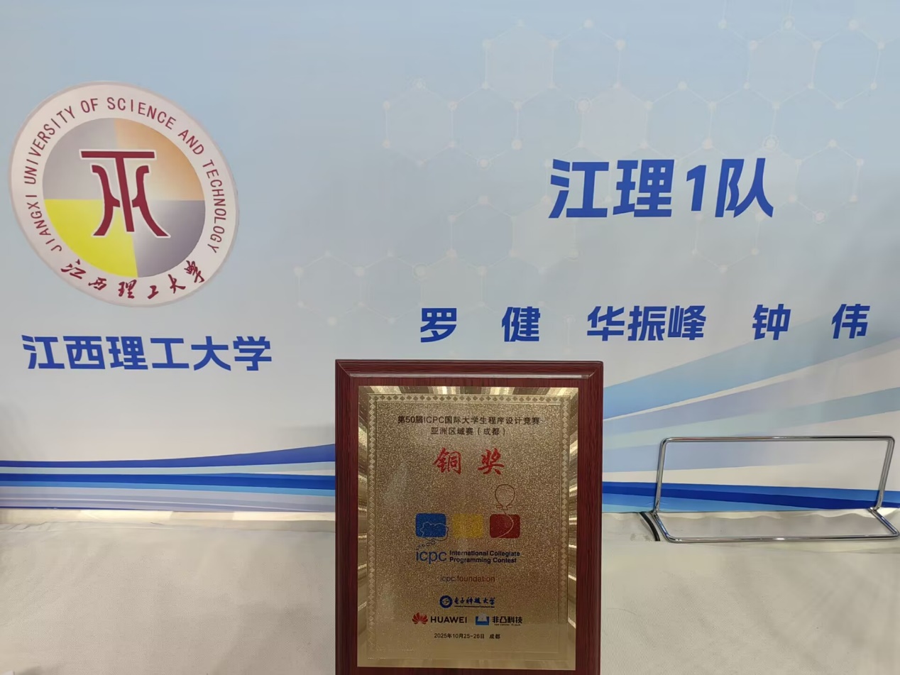 近日,第50届ICPC国际大学生程序设计竞赛亚洲区域赛(成都站)在电子科技大学圆满落幕。本次大赛由ICPC亚洲区委员会授权、电子科技大学承办,共吸引来自清华大学、北京大学、上海交通大学、复旦大学、浙江大学、中国科学技术大学等188所高校的320支队伍同台竞技。经过激烈角逐,由信息工程学院管希东老师指导,2023级计算机科学与技术3班华振峰、2023级计算机科学与技术1班钟伟及2023级电子信息科学与技术专业罗健三位同学组成的“江理1队”奋勇拼搏,最终荣获铜牌。