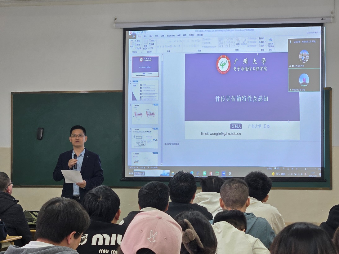 12月1日下午,信息工程学院特邀广州大学电子与通信工程学院王杰教授,以线上形式作了题为“骨传导传输特性及感知”的专题学术讲座。本次讲座地点为九章楼316教室,学院副院长许春冬教授主持,80余名师生参加了报告会。