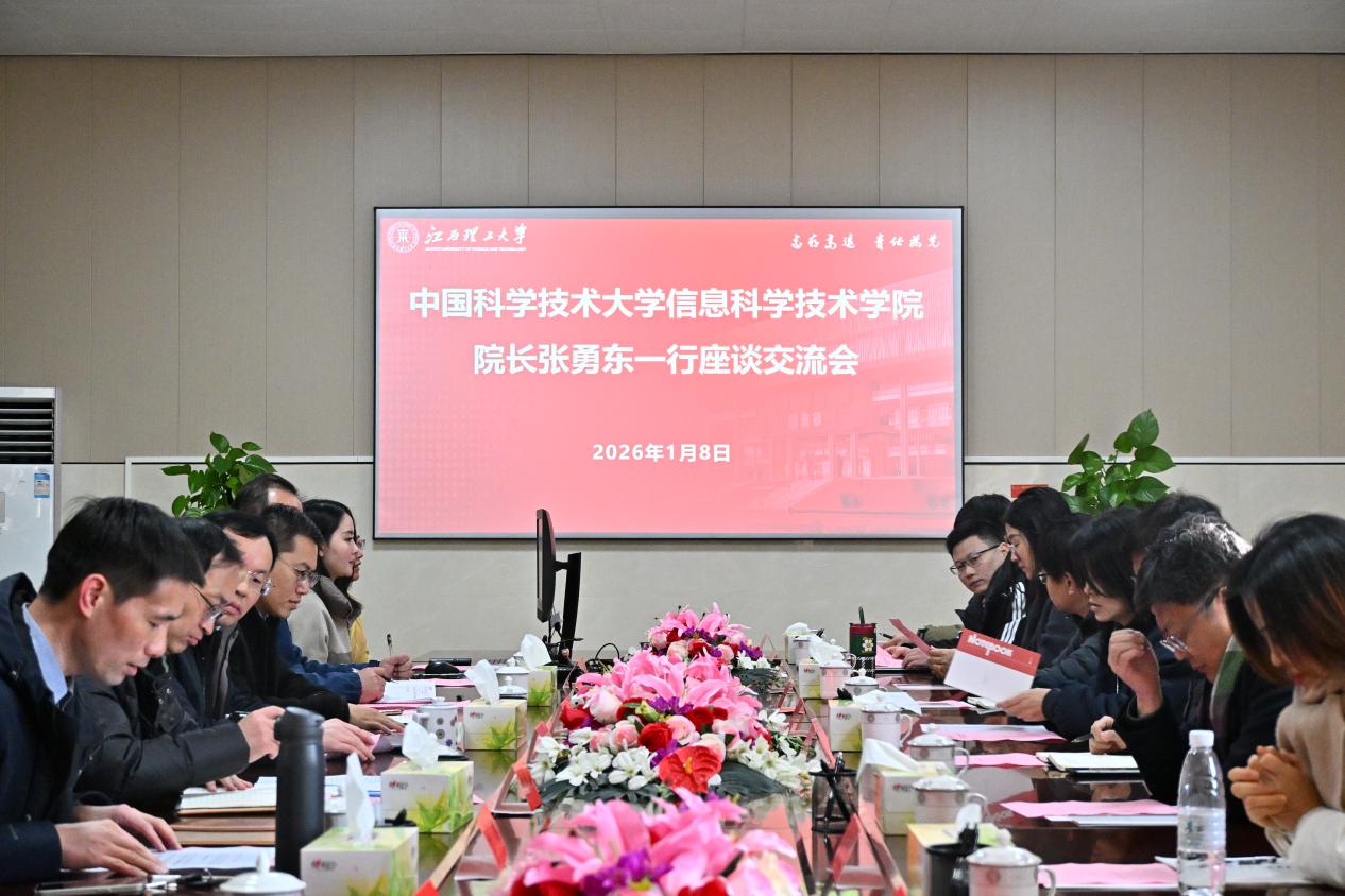 1月8日,中国科学技术大学信息科学技术学院党委书记李斌、执行院长张勇东一行专程到访我院,开展调研座谈与学术交流活动。双方围绕党建工作创新、科研管理、学科发展规划以及人工智能在高校治理中的赋能应用等主题展开了深入研讨。我院党委书记刘晓军、院长杨书新、党委副书记王吉源、副院长许春冬、李伟及相关专业系主任共同参加了此次交流活动。