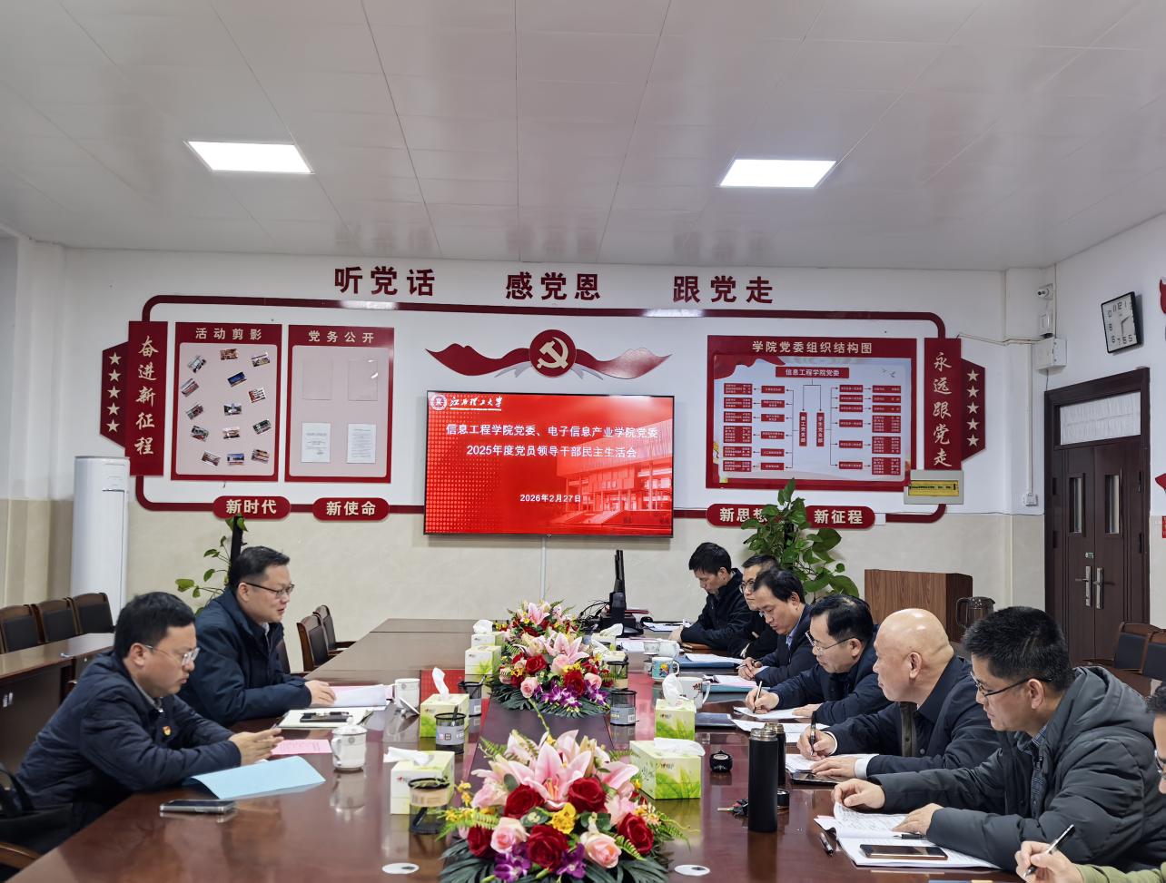 2月27日下午,信息工程学院党委、电子信息产业学院党委在三江校区九章楼305党员活动室联合召开2025年度党员领导干部民主生活会。学校党委第五督导组组长、校党委常委、副校长熊志华,督导组成员、研究生院副院长兼学科建设办公室副主任汪志刚到会指导。信息工程学院党委班子成员、电子信息产业学院党委班子成员、专职组织员、学院教师党支部书记代表参加会议,会议由信息工程学院党委书记刘晓军主持。